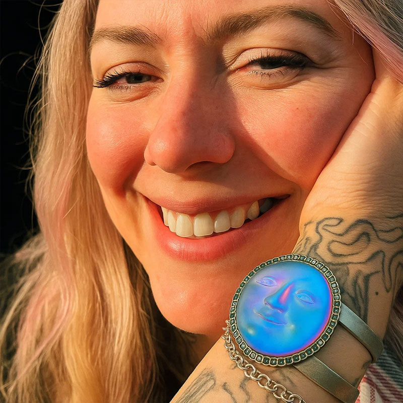 This bracelet features a delicate circular dial design with a God's face pattern printed at the center. Through a special optical coating process, the pattern achieves a color-changing effect. When viewed from different angles, the pattern displays a dreamy blue-green gradient, resembling the radiant glow of divine light, exuding artistic flair and visual impact, making it a standout fashion statement.
